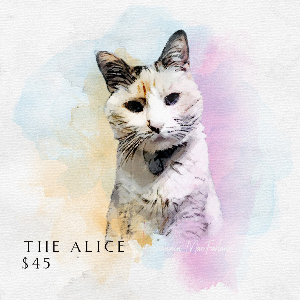 The Alice is a loose, whimsical, square (it is not available as a rectangular piece) style that pairs a pastel and watercolor portrait with a watercolor wash. The Alice is named after an adorable calico who is bold, splendid, and gentle. The watercolor wash colors in the background are created for each subject and you can tell me what colors you'd like or I can read your love's aura and include what I see.