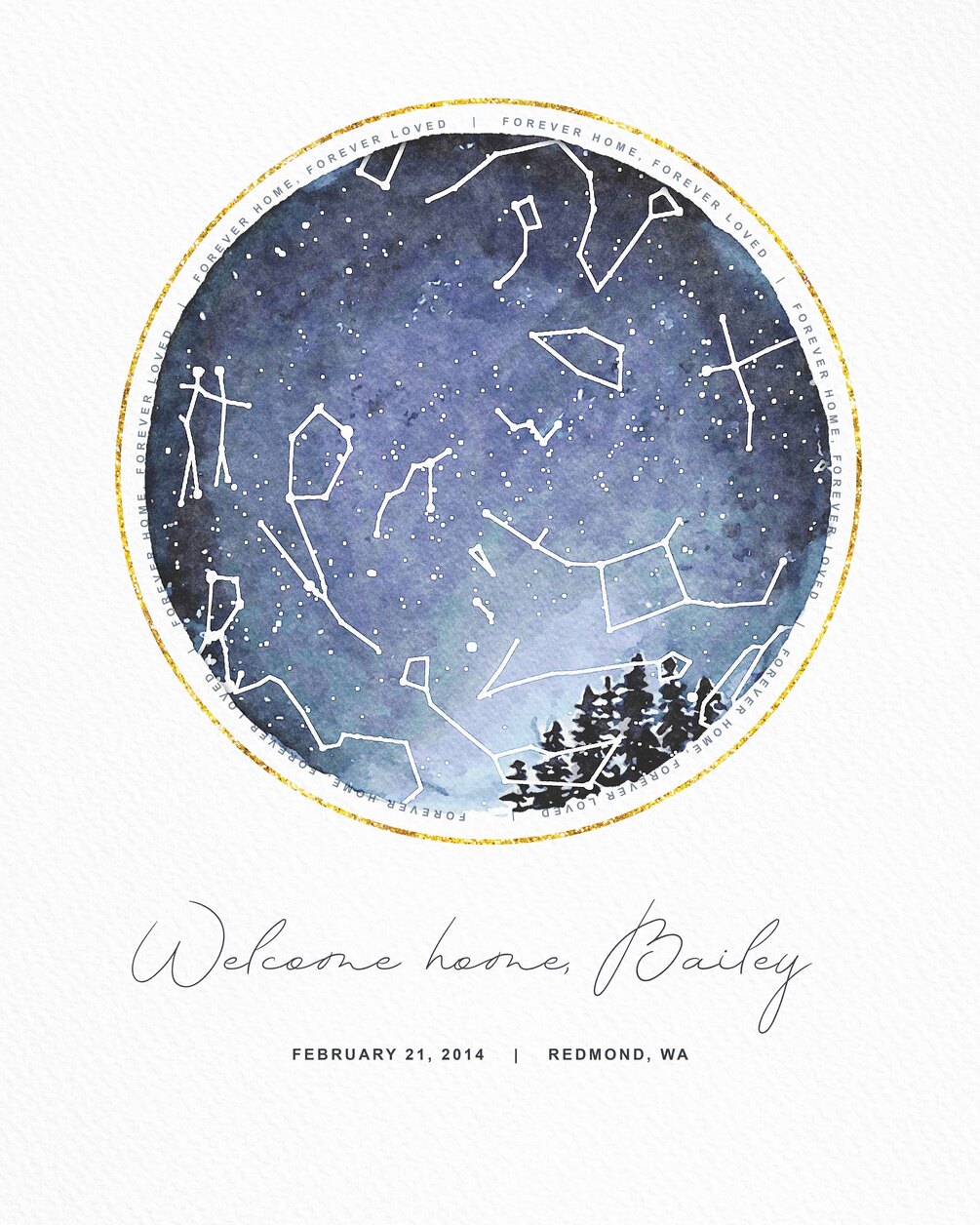 Honor a particular moment and place in time with a map of the stars as they looked in that instant. Based on a location and time you provide, I digitally paint the stars in their known positions. The background is a watercolor portrait of the night sky with a few evergreen trees in silhouette in the lower right. You have the option to include text that circles around the map or have no text; likewise you can choose a gold circle or no circle.